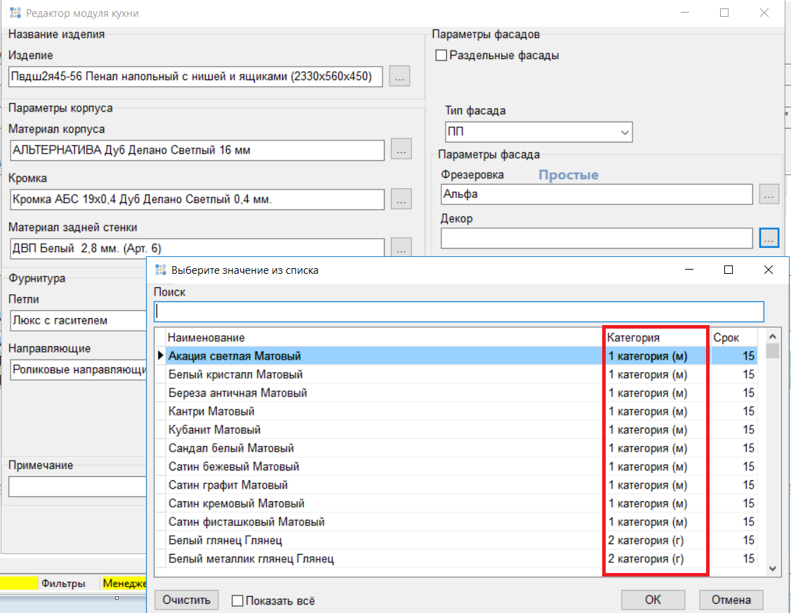 14.3 При выборе декора в редакторе фасада ПП добавлена колонка с категорией декора (1 категория, 2 категория и т.п.)