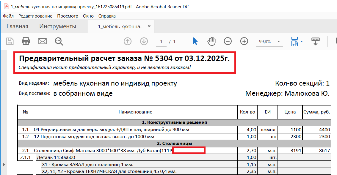 7.4 Если Заказ имеет статус «Расчет» - тогда в спецификацию не выводятся подписи. Текст «Заказ №» заменяется на «Предварительный расчет заказа №». Под номером будет размещаться текст «Спецификация носит предварительный характер, и не является заказом».