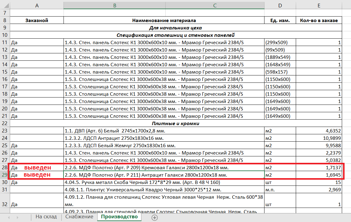 4. Изменены настройки по отображению позиций в Спецификации на производство. Сейчас в данном разделе будут отображаться не только позиции из заказа со статусом «Складской» или «Заказной», но и позиции со статусом «Выведен» и «Временно отсутствует». (#8443)