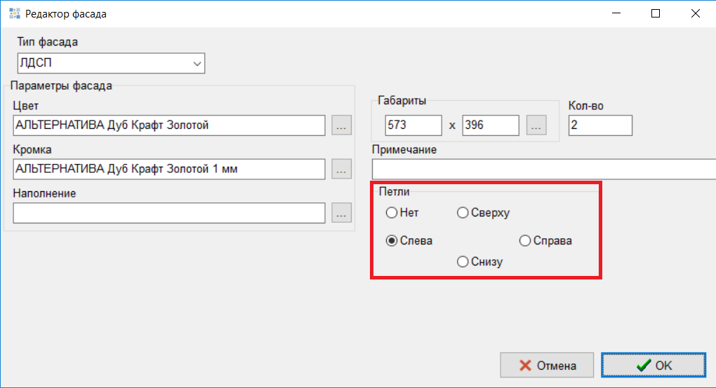 6. В редактор фасадов отдельных (не в составе изделия) добавлен дополнительный реквизит «Расположение петель», варианты заполнения - Нет, и 4 стороны на выбор (сверху, снизу, слева, справа).