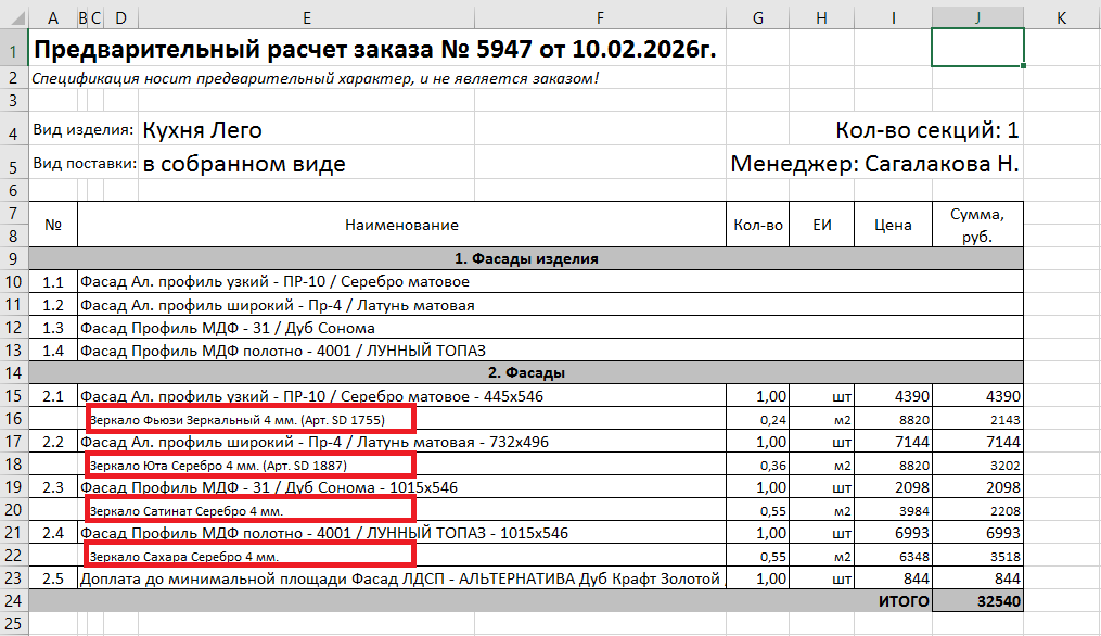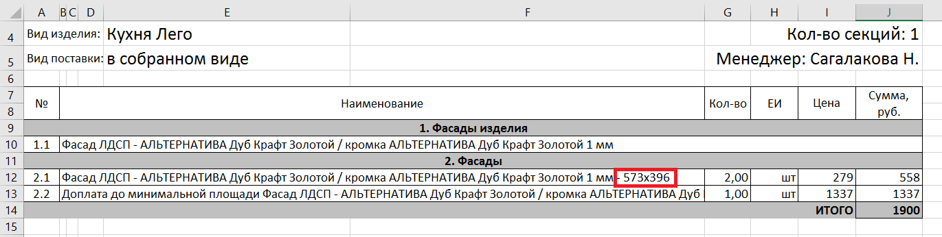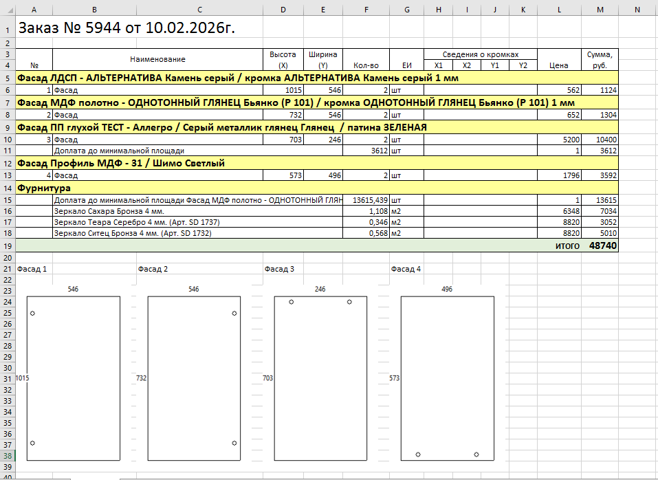 В спецификации на изделия кроме "Детали в размер" добавлены габариты фасада в конце наименования фасада, формат «высота*ширина».