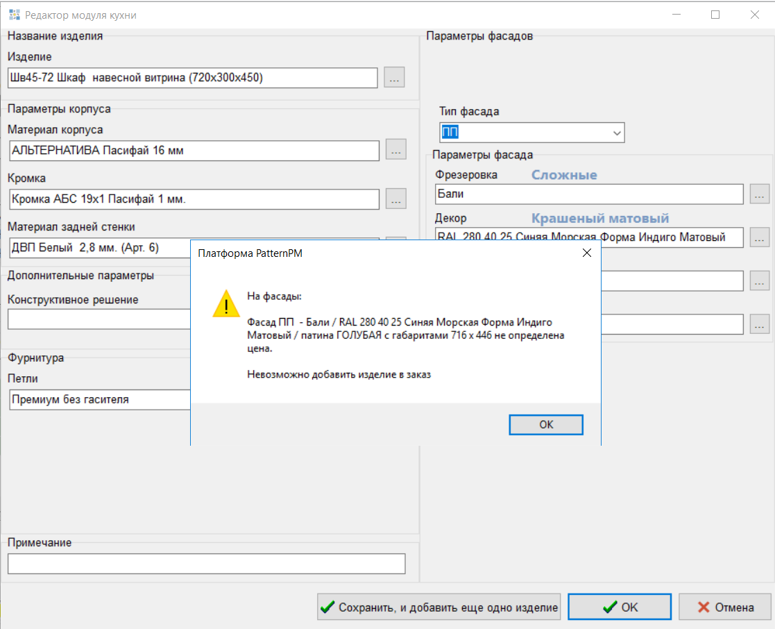 При добавлении корпуса в заказ с фасадом также осуществляется проверка, что цена на фасад больше 0. Если хотя бы на 1 фасад цена =0, то выводится сообщение общее на все фасады со списком: