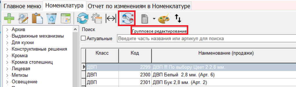 11.1 Создан Режим, позволяющий вносить изменения сразу по группе позиций номенклатуры, запускается из Справочника номенклатуры по отдельной кнопке, см рисунок ниже.