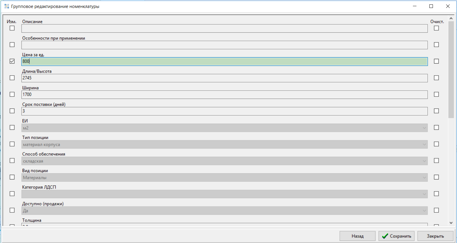 При установке флага «Изменить», поле подсвечивается зеленым цветом и становится доступным для редактирования, пользователь может указать новое нужное значение.