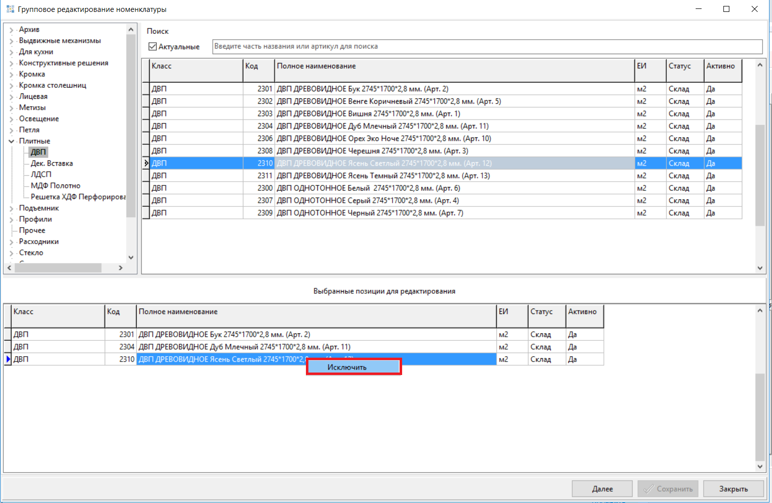 Можно удалить ошибочно выбранную позицию, для этого нажать правую кнопку мыши – «Исключить».