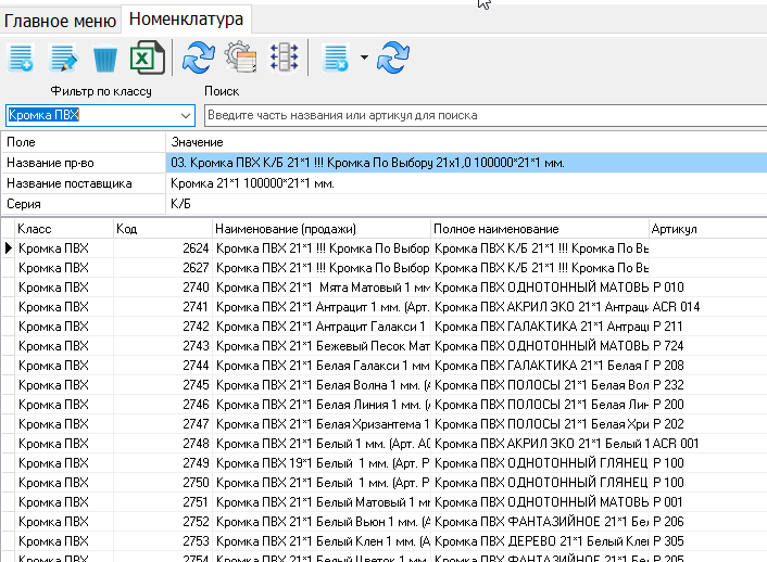 4. В справочнике номенклатуры добавлен отбор по классу материала.