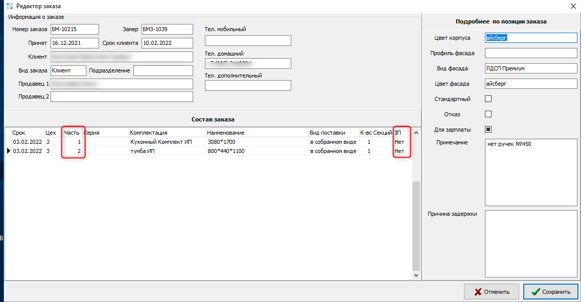 1. Доработан редактор заказа в режиме "Реестр производственных заказов" - добавлены поля "Часть" и "ЗП" - по ним можно быстро сориентироваться, к какой части заказа относится позиция, и будет ли на нее начисляться заработная плата.