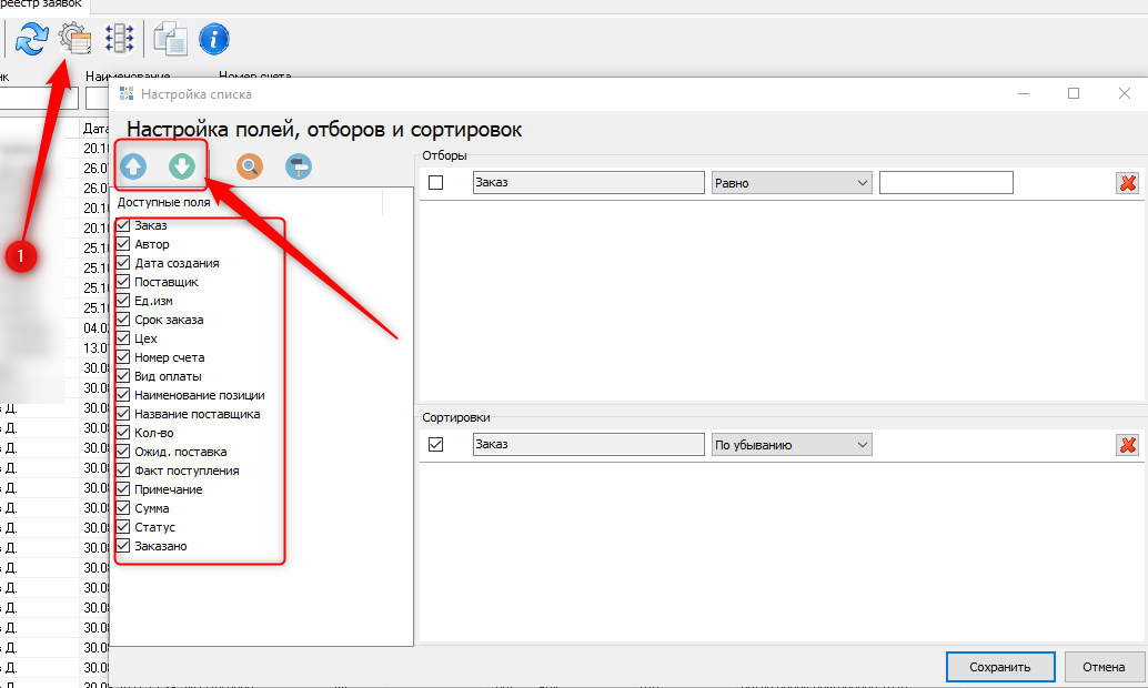 1.2. В настройках представления можно изменять порядок столбцов, нажав на столбец и щелкая кнопку "Вверх" или "Вниз" для его перемещения в списке. При нажатии на кнопку "Сохранить" столбцы будут размещены в настроенном порядке.