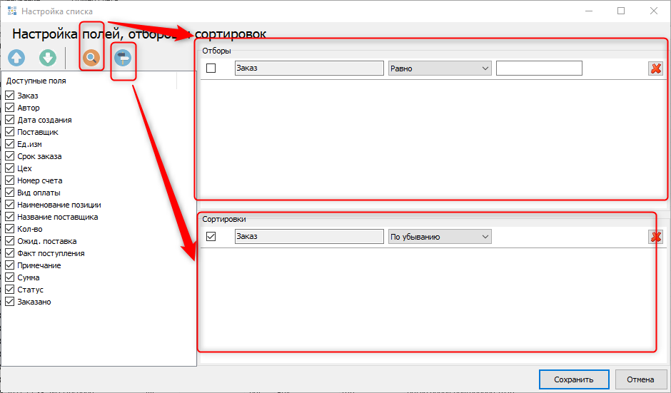 1.3. В настройках представления отборы и сортировки теперь расположены на одном окне вместе с остальными параметрами. Добавить новые поля в отбор можно нажав на соответствующую кнопку, или просто перетащив поле в зону отборов или сортировок: