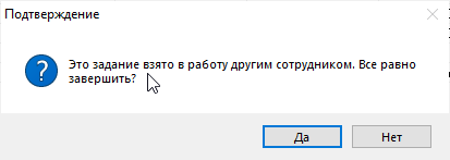 2.4. Для пользователя с правами "Администратор" на подсистему учета стекла-зеркала в реестре заданий КБ добавлена возможность завершить обработку задания, который начат другим сотрудником. При попытке завершения система предупредит, что задание чужое, но позволит его завершить.