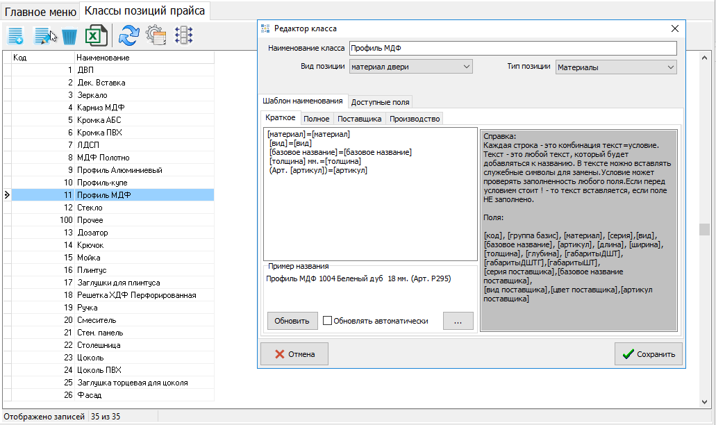 5. Добавлен инструмент редактирования классов материалов (видов материалов) с возможностью выбора доступных полей и изменения формул названий.