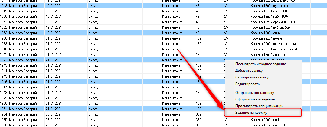 4.2. Реализована выгрузка Заказа на кромку в Excel для отправки поставщику. Необходимо в Реестре заявок на снабжение выделить строчки, нажать правой кнопкой мыши, и выбрать в меню пункт "Задание на кромку".