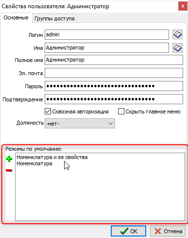 В режиме "Администрирование" - "Управление пользователями" в карточке пользователя появился раздел "Режимы по умолчанию", куда можно добавить и откуда можно удалить позиции.