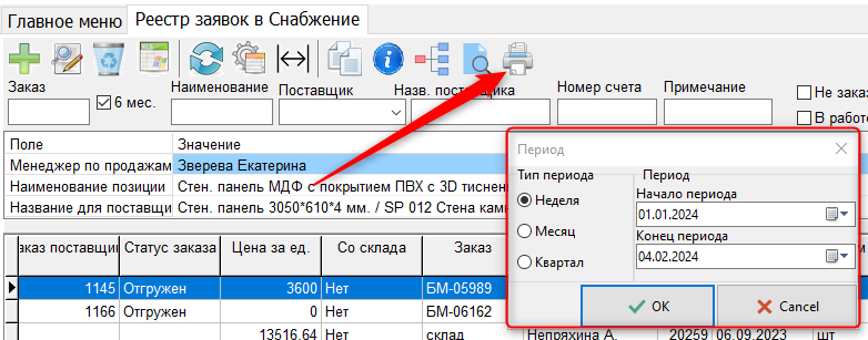В результате в Excel выгружаются Заявки на снабжение, которые поступили в указанном подпериоде.