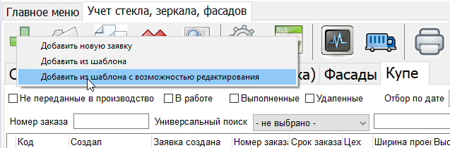 5. Реализовано заполнение Заявки на купе из шаблона с возможностью последующего редактирования (#7512) в режиме "Учет стекла, зеркала, фасадов"