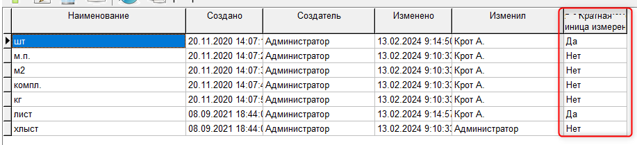1.1. В справочнике "Единицы измерения" указать признак "Кратная" для тех позиций, которые считаются цельно и не могут быть разделены.