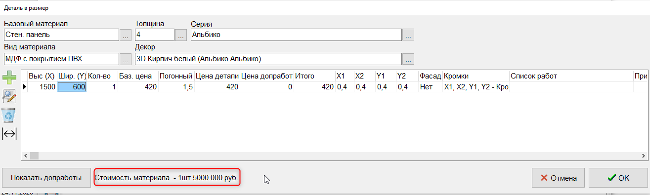 1.3. При оформлении детали из материала с кратной единицей учета при расчете цены будет использоваться лист или штука целиком, даже если размер детали меньше. При этом в нижней части окна будет указана стоимость материала