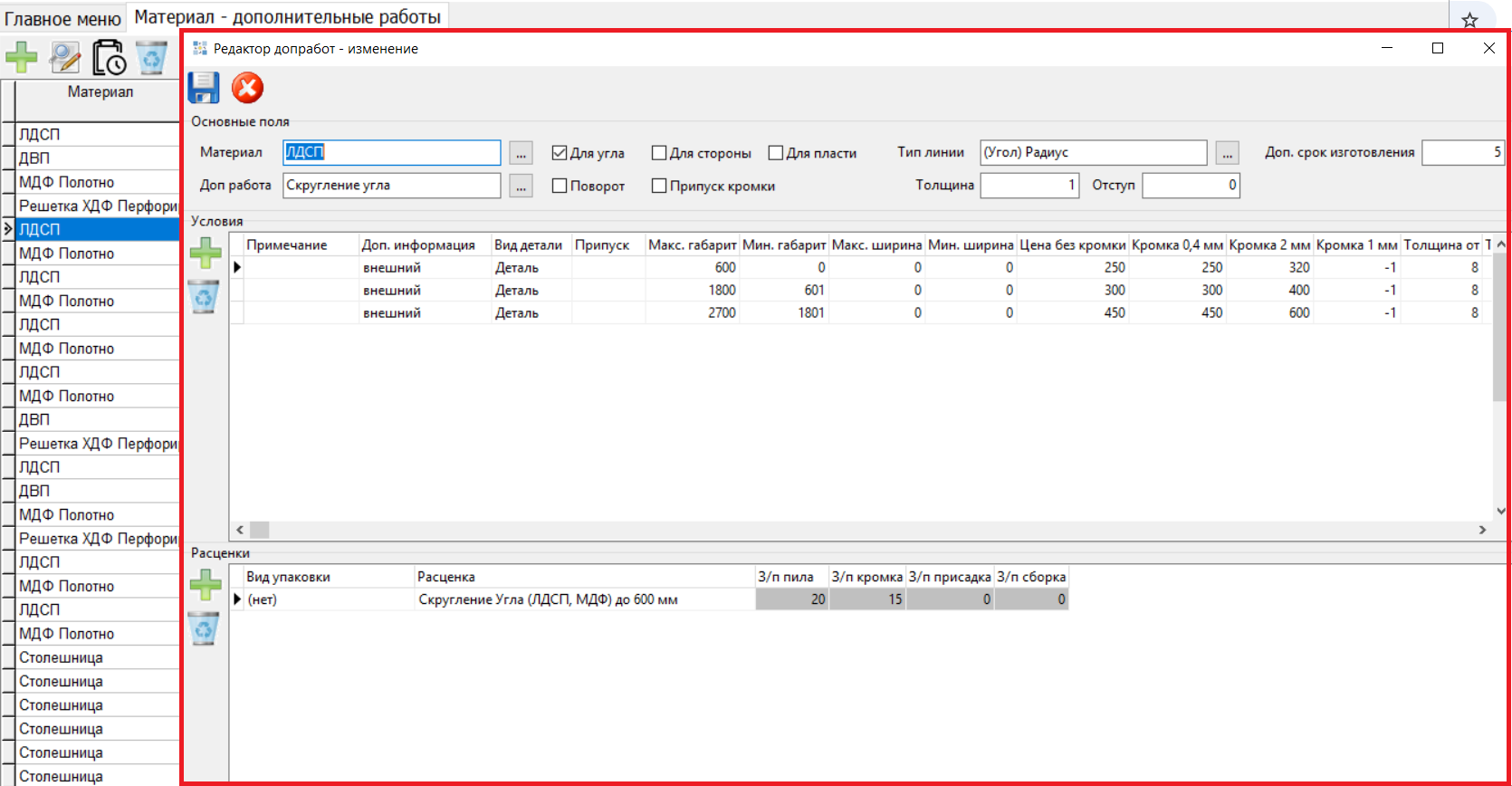 2. Создан алгоритм расчета зарплаты за допдетали при загрузке из файла XML. Создан редактор для привязывания расценок к Доп. операциям. В редакторе для выбранной операции можно отредактировать условия, связь с расценками для условия, а также сами расценки, если необходимо. (#7612)