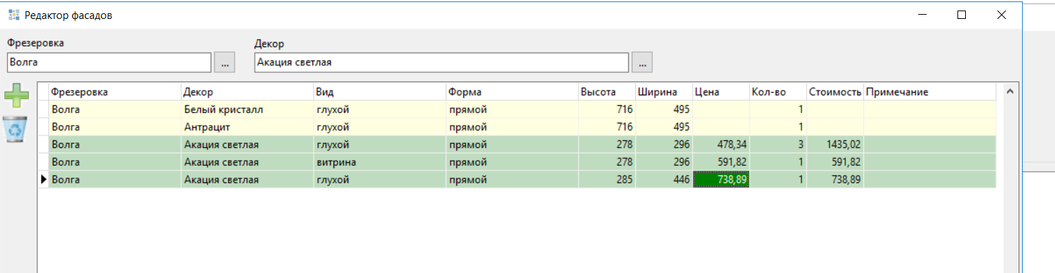 Настроена подсветка фасадов в окне редактора заказа и редакторе фасадов: стандартные фасады выделяются зеленым цветом, нестандартные - желтым. (#7649)