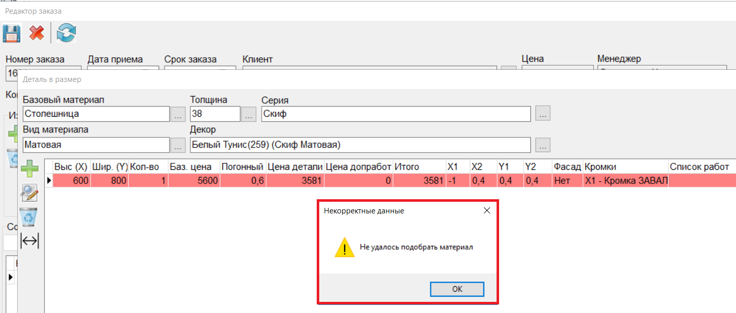 4. Доработан подбор позиций в Продажах, сейчас декоры со статусом «Выведено» исключаются. При попытке добавить позицию с декором в статусе «Выведено» на экран выводится сообщение об ошибке «Не удалось подобрать материал», позиция в заказ не добавляется. (#7705)