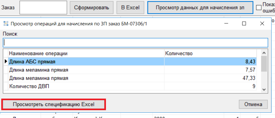 4. В производственной зарплате (новая) при нажатии кнопки "Просмотр данных для начисления зп" в открывшемся окне добавлена кнопка "Просмотреть спецификацию Excel". При нажатии на данную кнопку открывается файл Спецификации Excel, если он приложен к Заказу. (#7820)