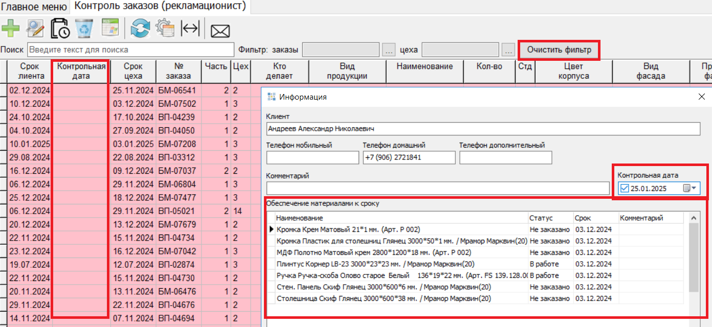 2. Произведены доработки в режиме просмотра «Контроль заказов (рекламационист)»