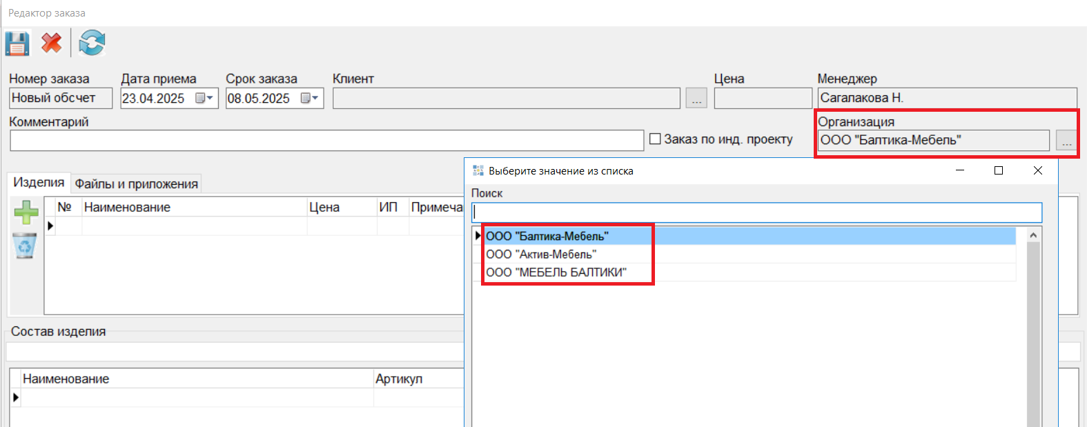3.2 Реализована возможность выбора организации в редакторе заказа. Данные об организации передаются в 1С.