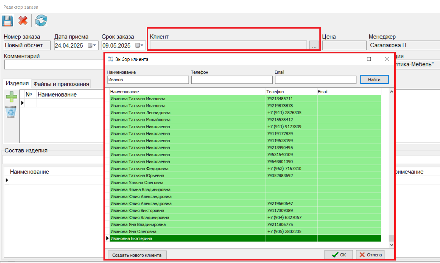 3.3 При поиске клиента в редакторе заказа зеленым цветом подсвечиваются строки клиентов, найденных/синхронизированных с 1С, белым - клиенты, которые сейчас существуют только в АРМ, и при выборе будут созданы в 1С после отправки заказа в 1С. (#8002)