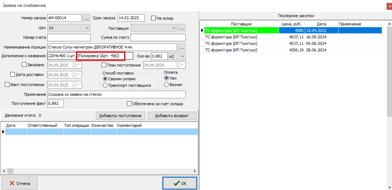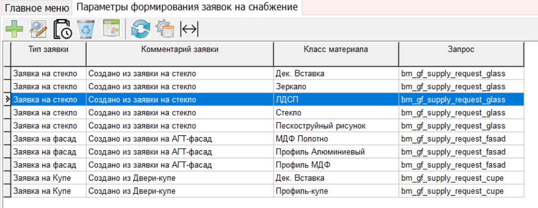 Сейчас процедура создания в зависимости от типа заявки подбирает класс материала из полей нового справочника. При обновлении старые заявки на снабжение удаляются и создаются новые. В заявку на снабжение по заказу стекла переносится тип обработки (шлифовка/полировка). (#7895)