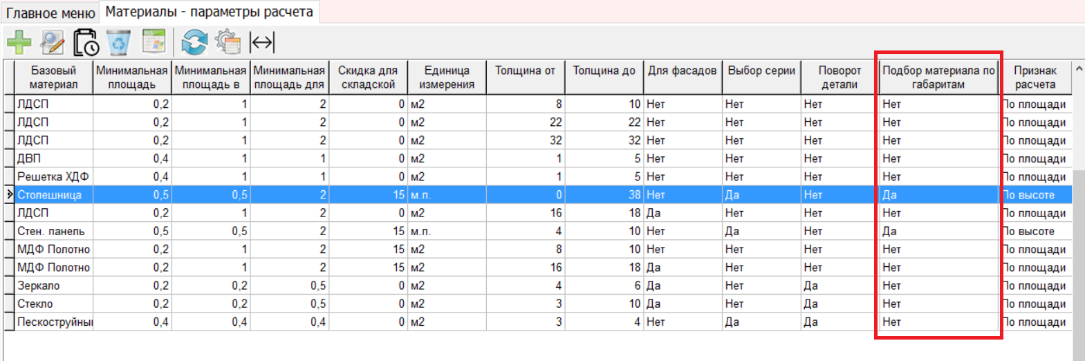 1.2 Для материалов, для которых в справочнике «Материалы - параметры расчета» установлено значение «Да» по параметру «Подбор материала по габаритам» и если есть запись в справочнике «Припуск для кромок в классах материалов» для выбранной кромки по данной стороне, то при расчете габарита материала будет добавляться величина припуска. (#7963)