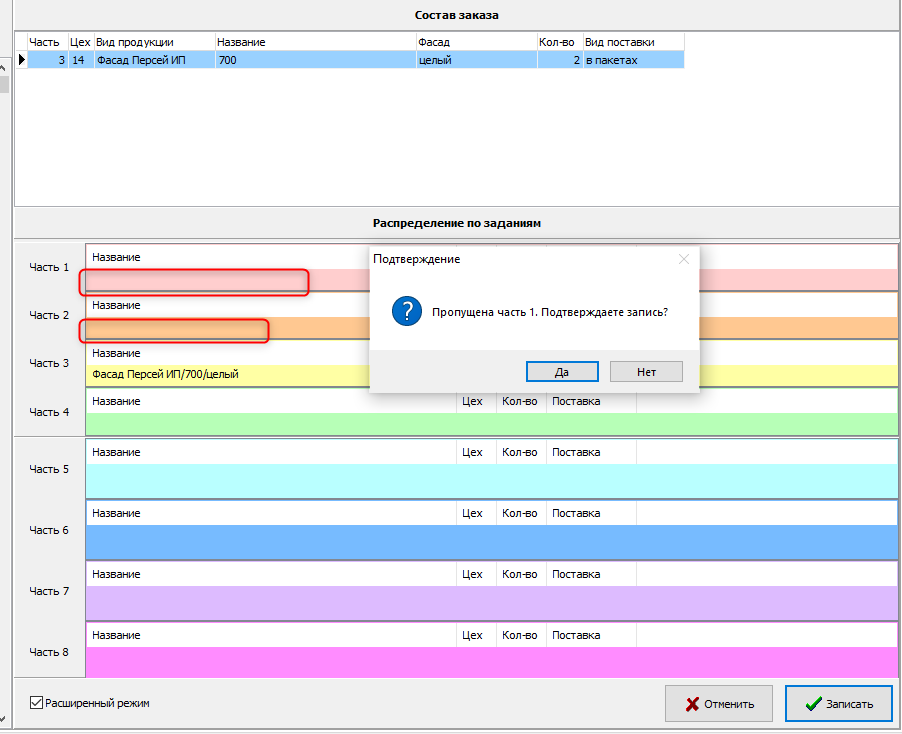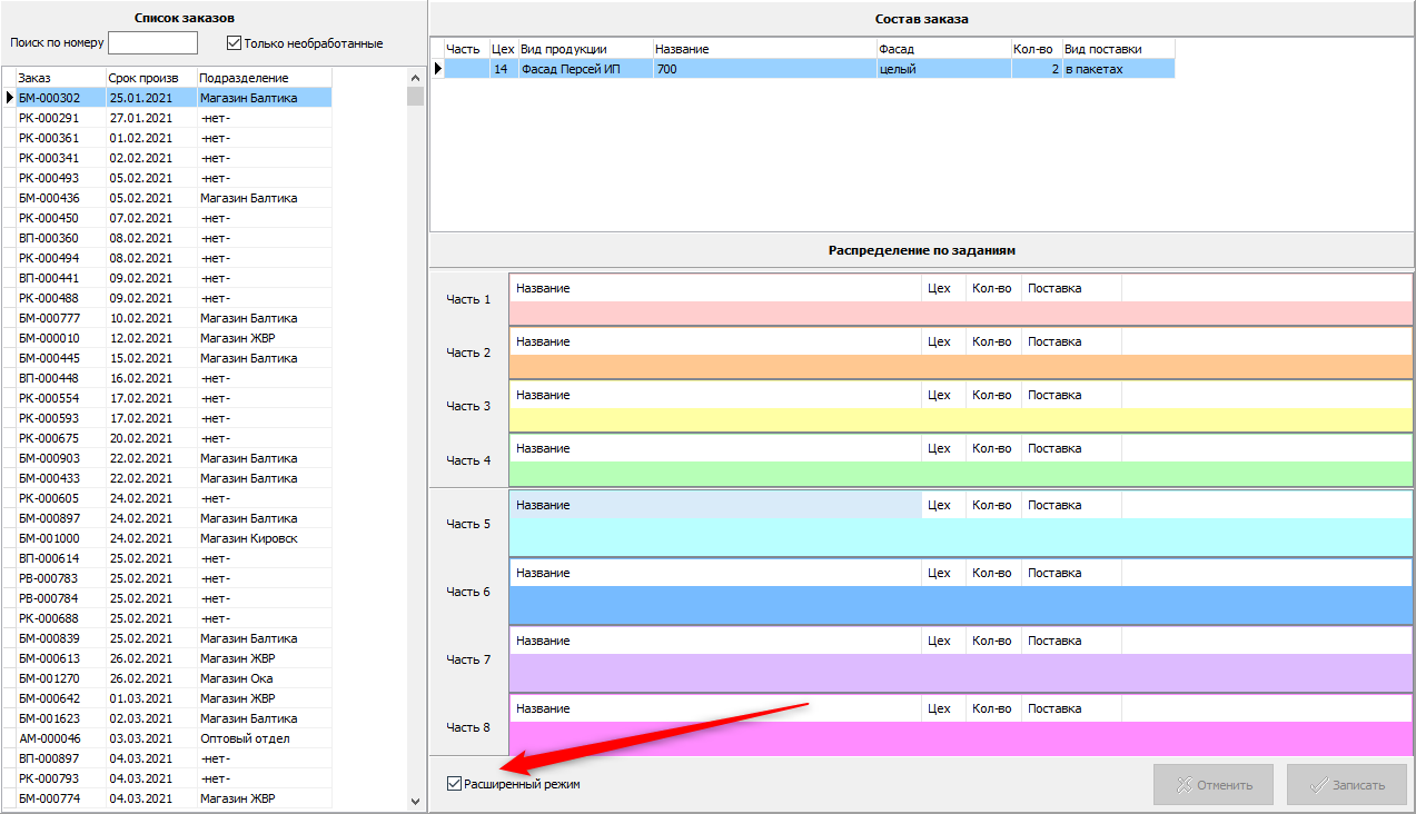 1.1. Реализована возможность делить заказ более чем на 4 задания (для крупных оптовых заказов). Для этого необходимо включить флаг "Расширенный режим".
