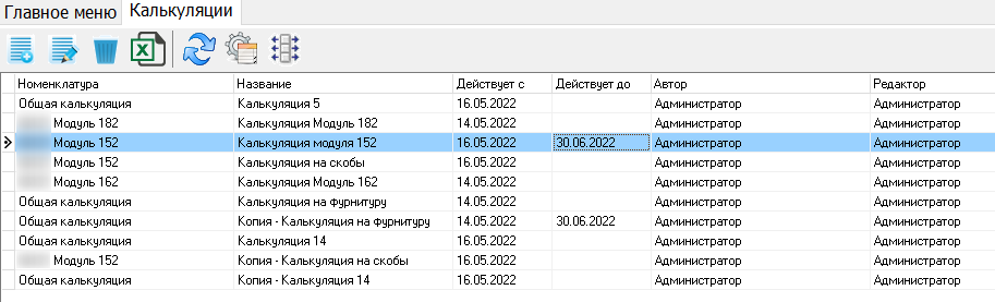 Для управления калькуляциями служат стандартные кнопки в верхней части окна программы: