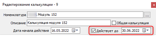 Также можно указать дату начала действия калькуляции. По умолчанию, все калькуляции действуют бессрочно, но если установить флаг "Действует до" - то появится поле для ввода даты завершения действия калькуляции.