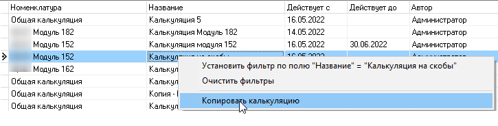 Для копирования калькуляции необходимо выделить ее в списке, нажать правую кнопку, и выбрать пункт "Копировать калькуляцию". В результате в списке появится калькуляция с таким же названием, у которой вначале будет добавлен префикс "Копия - ".