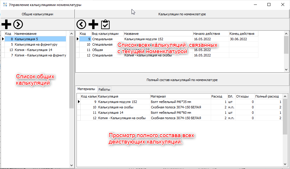 2. Калькуляции на номенклатуру - вызывается из Справочника "Номенклатура" - "Управление калькуляциями номенклатуры". Служит для проверки расхода материалов и состава работ, которые будут отражаться в себестоимости выбранной номенклатуры.