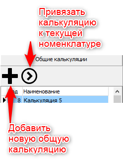 В левой части отображается список всех общих калькуляций, которые не привязаны к данной позиции номенклатуры. В верхней части списка расположены кнопки для добавления новых общих калькуляций, а также для привязки текущей выделенной калькуляции к номенклатуре, калькуляциями которой мы управляем.