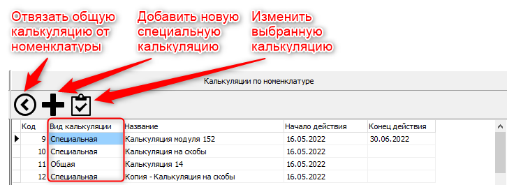 В правой верхней части окна программы расположен список всех калькуляций, которые на текущий момент привязаны к номенклатуре. В списке отображаются как общие калькуляции, так и специальные. Этот признак отражается в графе "Вид калькуляции". В верхней части списка расположены кнопки для отвязки общей калькуляции от номенклатуры, а также для добавления новой специальной калькуляции, и редактирования выбранной калькуляции.